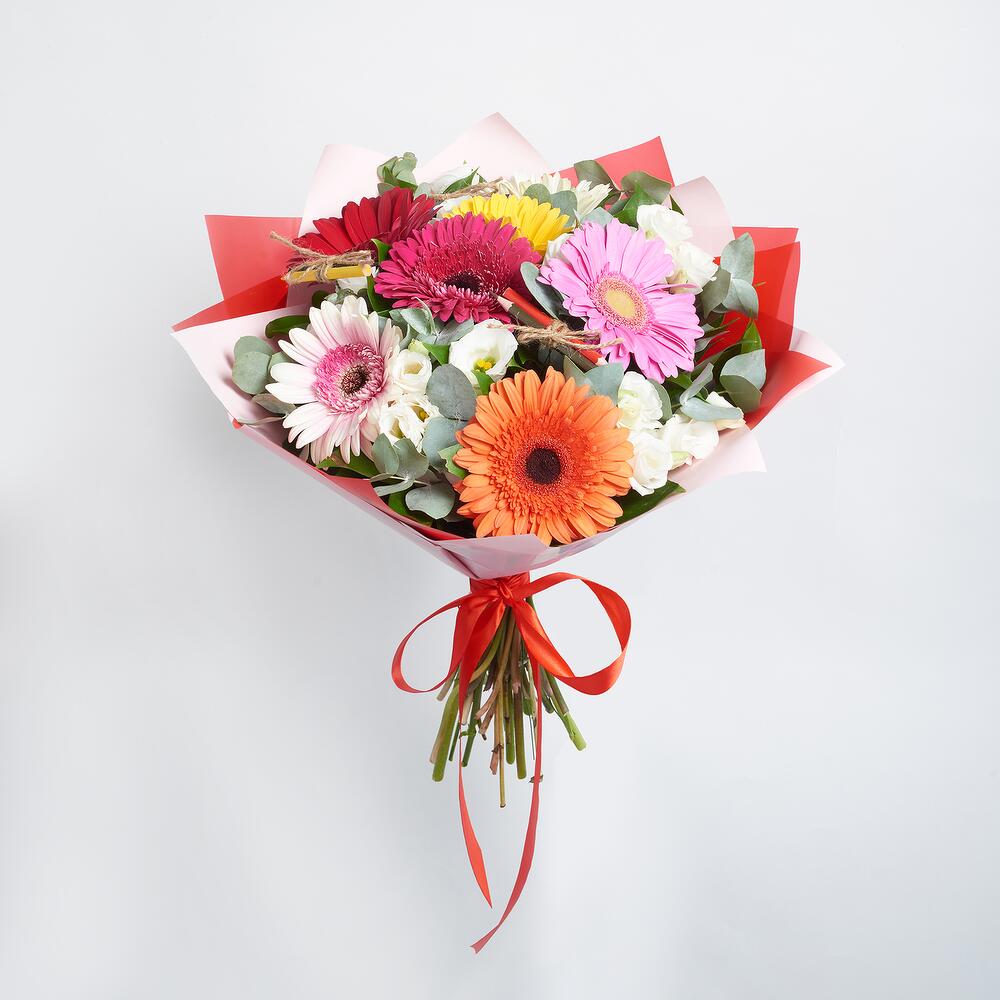 Лизиантус - 3 шт. Эвкалипт - 2 шт. Зелень - 1 шт. Гербера - 7 шт. Упаковка дизайнерская - 1 шт. Декор школьный - 3 шт.